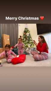 In the colourful snap, all three of his girls are wearing festive pyjamas as they sit underneath the Christmas tree.