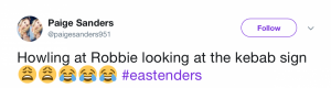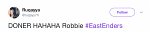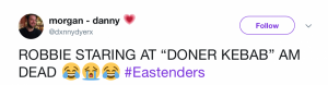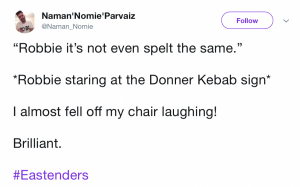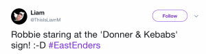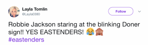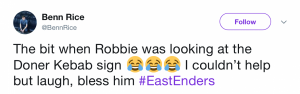 But while Sonia’s spelling lesson failed to put a smile on Robbie’s face, EastEnders fans took to Twitter in their droves to share their delight…
