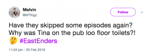 “Have they skipped some episodes again?” one fan wondered. “Why was Tina on the pub loo floor toilets?!”