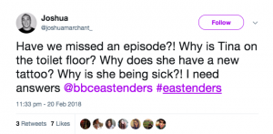“Have we missed an episode?! Why is Tina on the toilet floor? Why does she have a new tattoo? Why is she being sick?! I need answers,” ranted another.