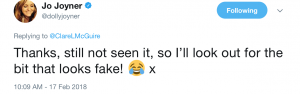 The fan then responded by admitting their error and went on to tell Jo what an excellent job she did throughout the emotional scenes…