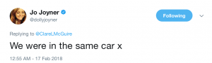 But Jo was quick to set the record straight and responded to confirm the pair were actually in the same car.