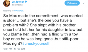 She even hit back at someone who blames Tanya for the way that Max had turned out – claiming Tanya was the one that had loose morals and that they were Team Max!
