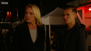 Hunter landed in the Square when Ciara came to claim the money Sharon stole in the heist. Ciara brought him with her – and Mel was very pleased to see her son.