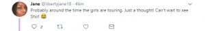 A fourth wrote “Probably around the time the girls are touring. Just a thought. Can’t wait to see Shirl” with a laughing emoji.