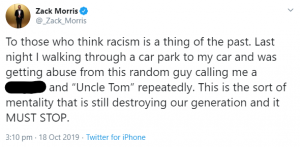 “Last night I walking through a car park to my car and was getting abuse from this random guy calling me a [expletive] and ‘Uncle Tom’ repeatedly.