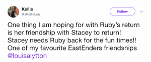But the overwhelming theory is that Ruby’s simply back to see her best mate, Stacey…
