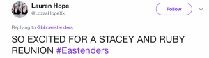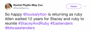 Will Ruby return to find she has changed so much over the years that she has nothing in common with Stacey these days? Stacey’s certainly been through a lot since her friend departed Walford.