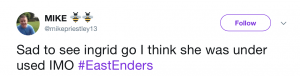 Despite the fact Ingrid has been on screen for less than a year, fans expressed their sadness that she was leaving Walford to go travelling.
