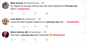 A third tweeted: “Looks like Albert Square missed out on Pancake Day then…”