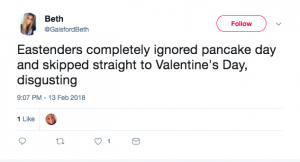 One furious tweeter even blasted: “EastEnders completely ignored Pancake Day and skipped straight to Valentine’s Day, disgusting.”